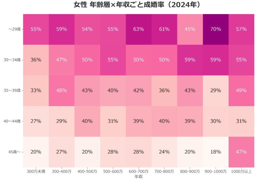 「株式会社IBJ 2024年版 成婚白書」によると、年収400万円の女性の成婚率は、全体的に高いことがわかりました。女性は年収に関係なく、若い方が成婚率が高いようです。