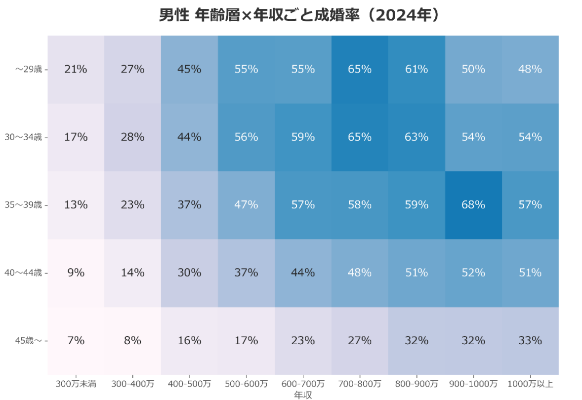 以下は、株式会社IBJの調べによる、男性の年齢と年収ごとの成婚率を割合で表した表です。