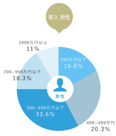 marlに入会している男性の年収は400万円以上がほとんどで、最も多いのは500万〜700万円の方です。なかには、1,000万円を超えるハイスペックな層も一定数存在します。