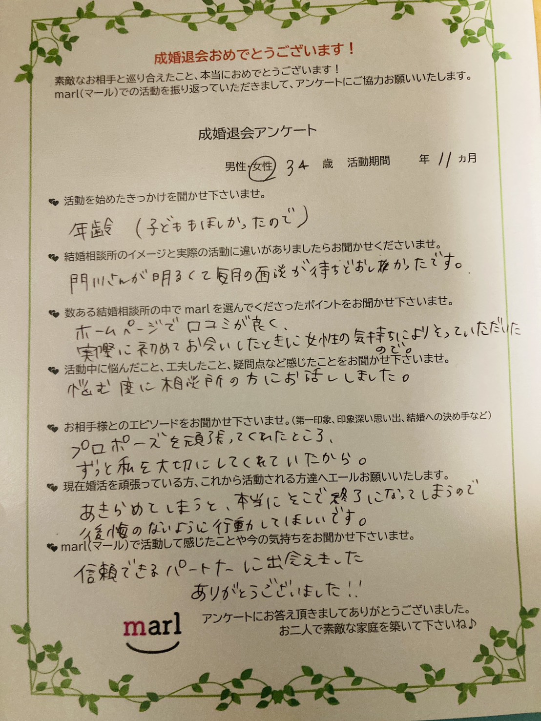 お見合いや仮交際が続き、戸惑うこともありましたが、その都度しっかり相談してくれて、自分の気持ちを言葉にしながら前へ進まれていました。