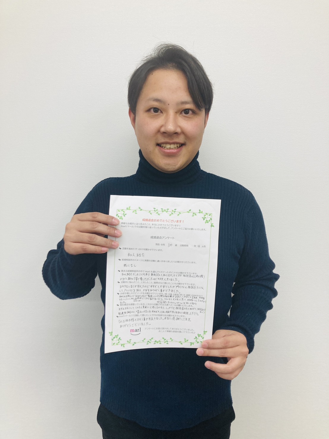 30歳男性会員様が、ご入会から6ヶ月でご成婚されました。